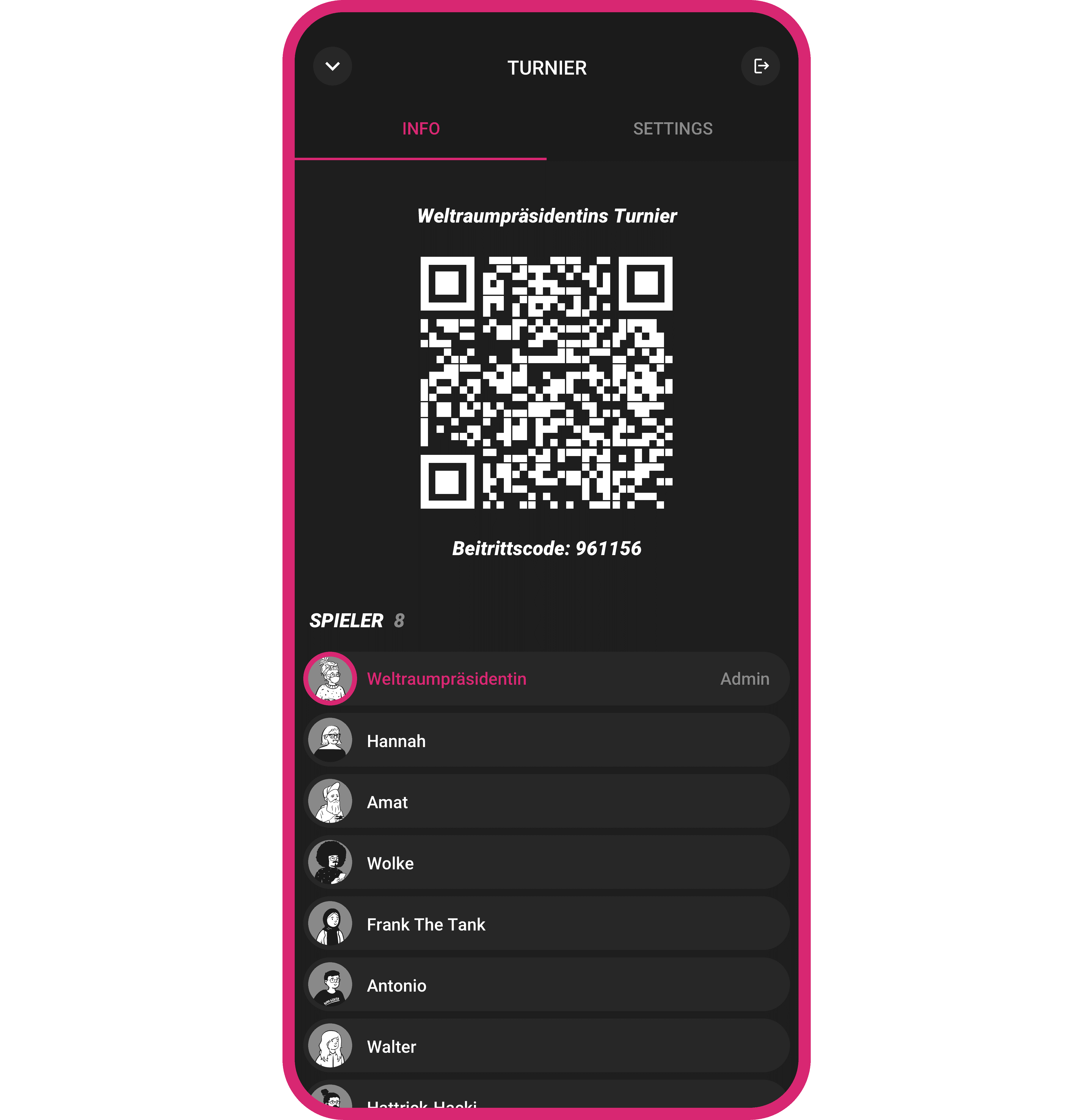 Erstelle Turniere und lade Leute durch einfaches scannen eines QR-Codes ein. Spieler:innen können jederzeit ein- und aussteigen.